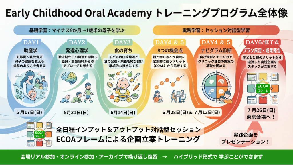 プログラムを通して「まなび」の意味やクリニックをより良くするための思考ワーク、ECOAフレームによる実践企画の構築をナビゲートします。