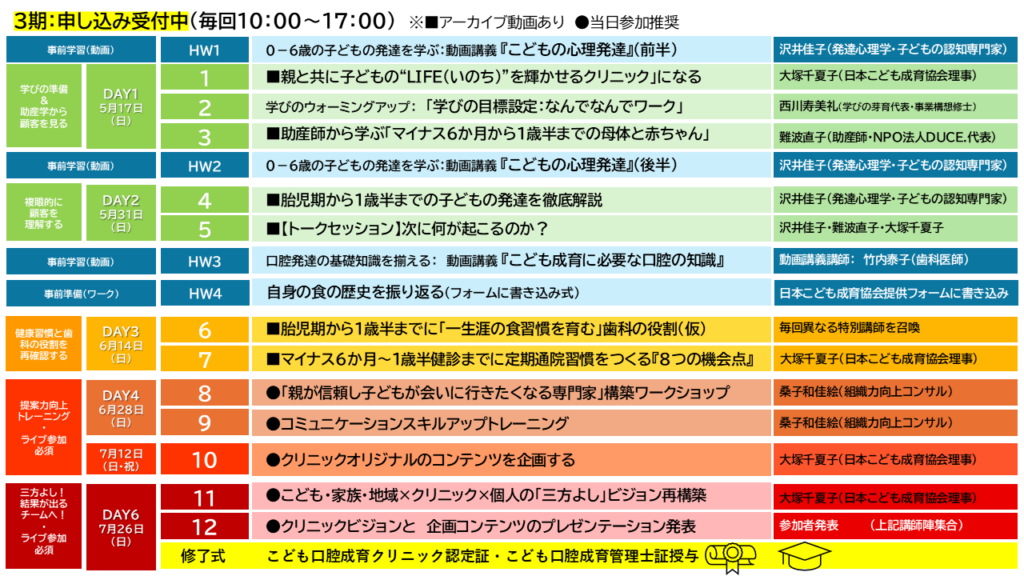 多職種の知見を一気通貫で学び、貴医院スタッフが実際に親子に提供する施策プランを期間内に完成させるプログラムです。