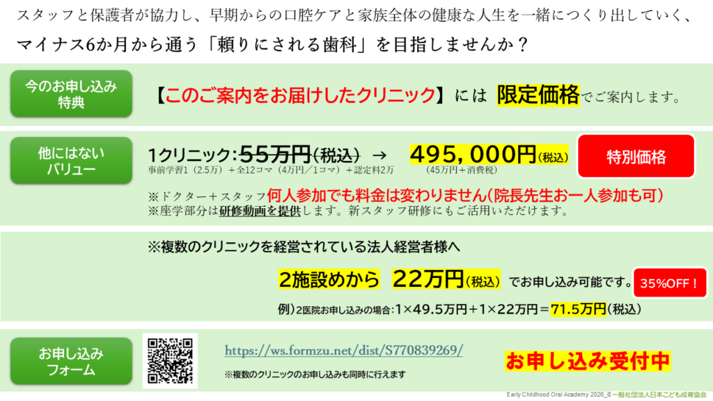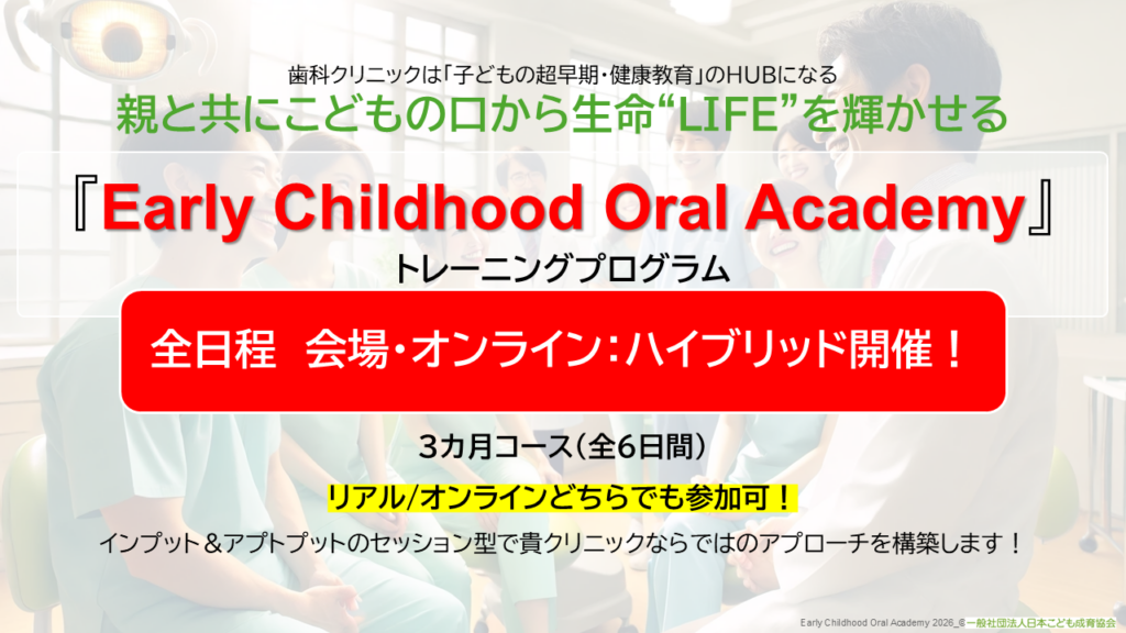 動画では歯科専門資格の有無にかかわらず、子どもの健やかな口腔発達に必要な口腔の知識の基礎を学びます。